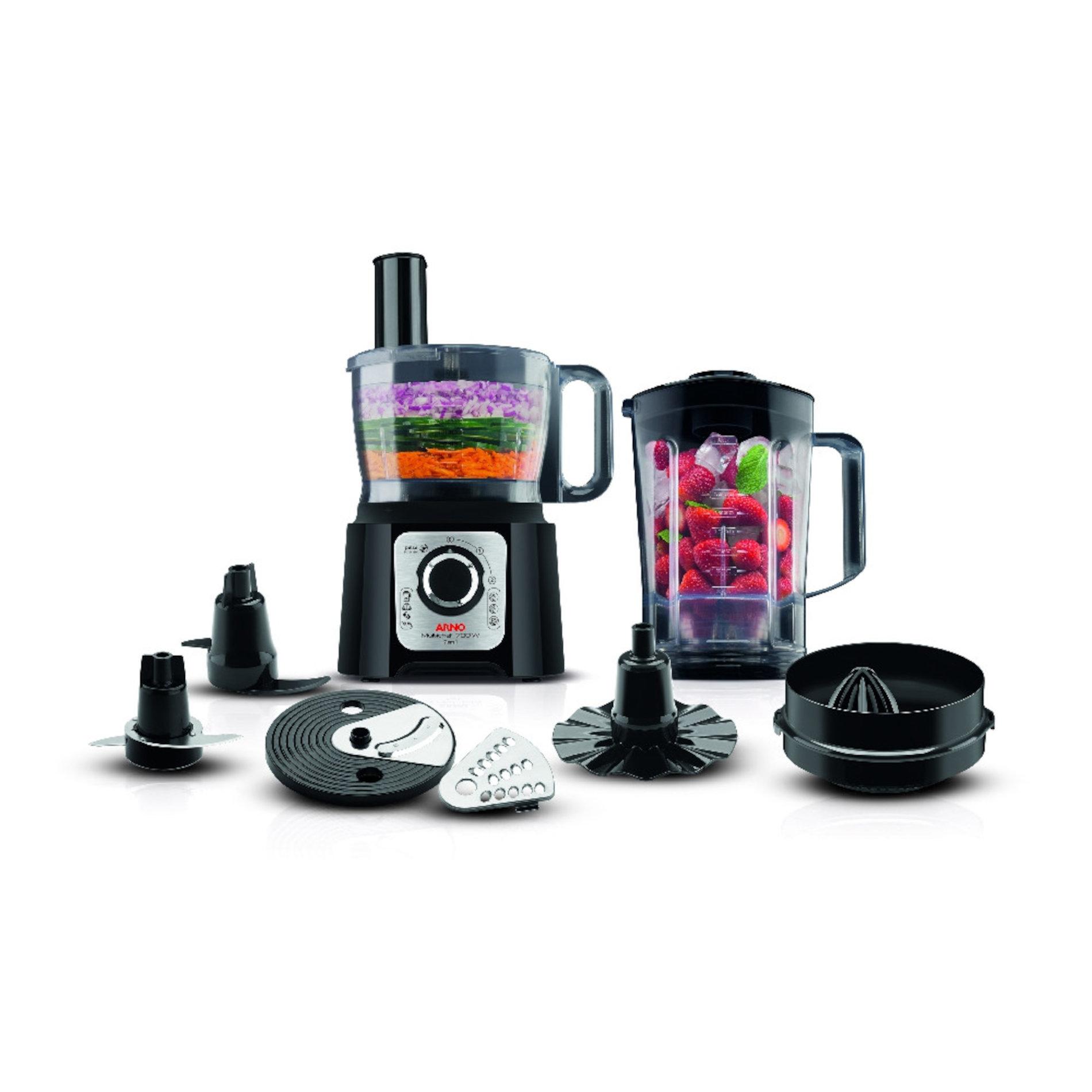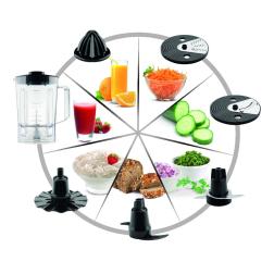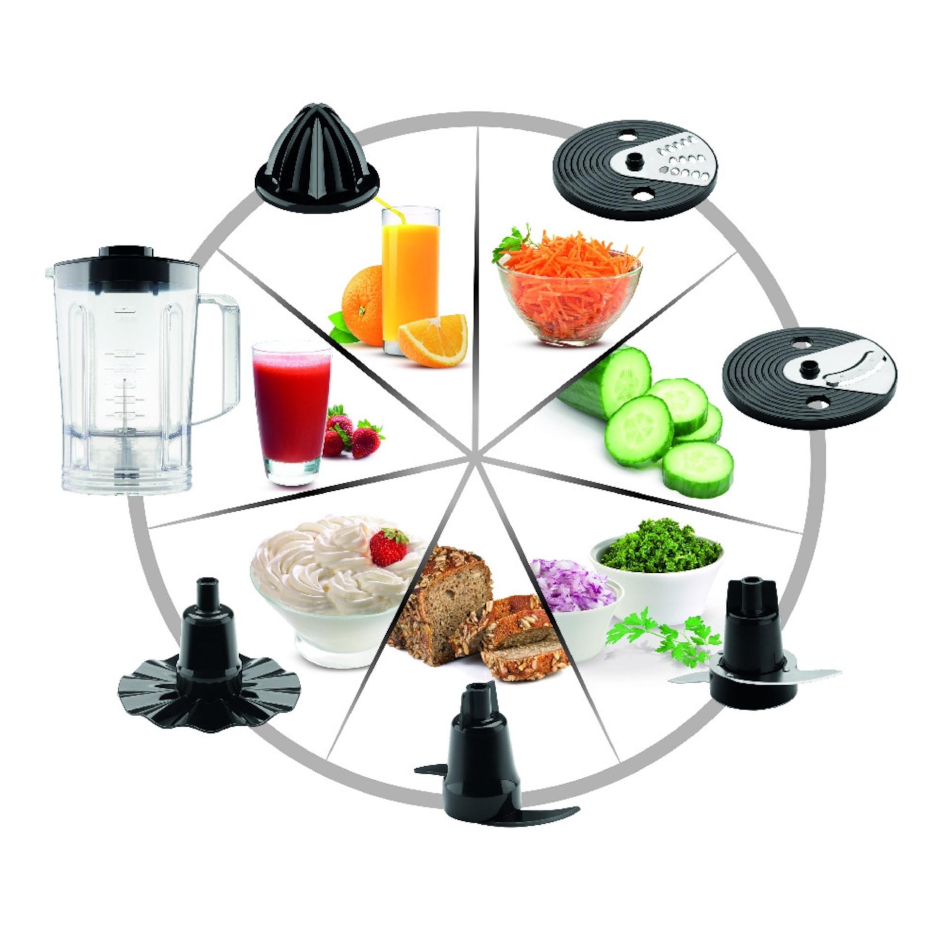 7 en 1 licua, pica, ralla, rebana, exprime, amasa y emulsiona. Con jarras de plástico (licuadora y picador). 2 velocidades + pulsar. Potencia 700W.